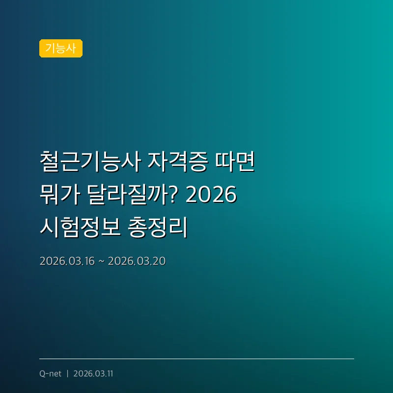 📝 철근기능사 시험정보 · 기출문제 철근기능사 시험일정, 출제기준, 기출문제를 확인하세요. 👉 철근기능사 시험정보 확인하기 👉 철근기능사 기출문제 다운로드 2026년 철근기능사 제2회 필기 접수가 오는 3월 16일부터 20일까지 진행됩니다. 철근기능사는 국가기술자격으로서 건설 분야의 건축 직무와 관련이 있으며, …